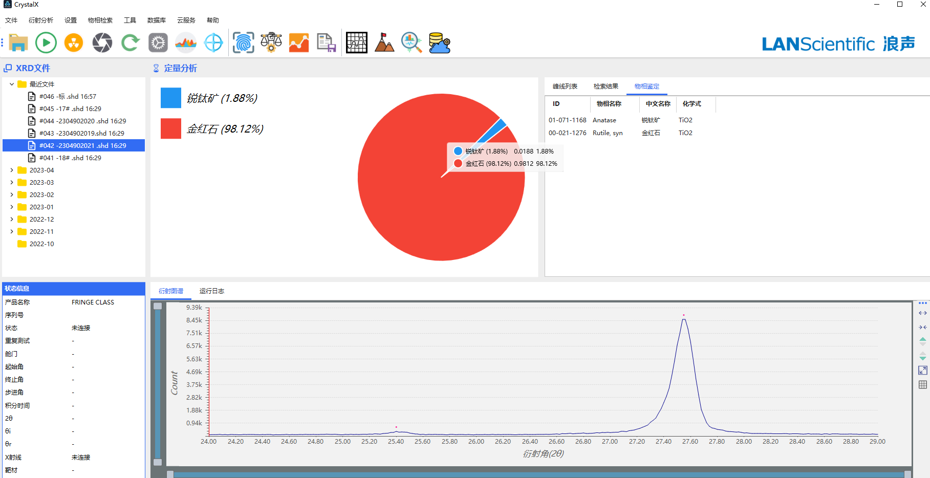 本实验采用苏州浪声科学仪器有限公司的界FRINGE CLASS桌面式X射线衍射仪,对某公司的钛白粉样品进行检测分析,采集样本的衍射图谱,对其进行金红石转化率R值的测定。